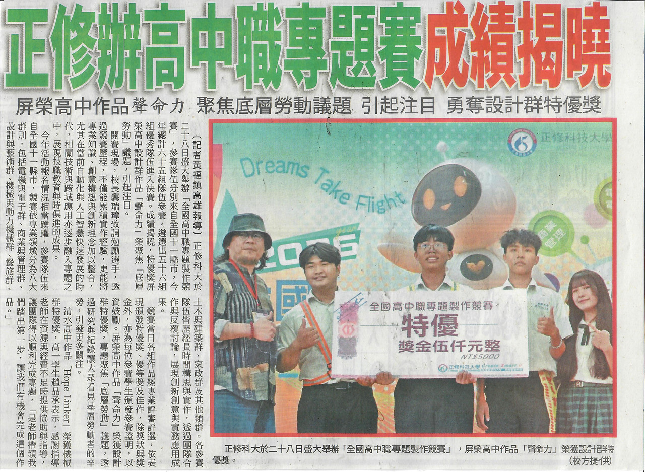 清水高中作品「Hope Linker」榮獲機械群特優獎,高一學生趙品承表示,感謝指導老師在資源與經費不足時提供協助與指導,讓團隊得以順利完成專題,「是老師帶領我們踏出第一步,讓我們有機會完成這個作品。」